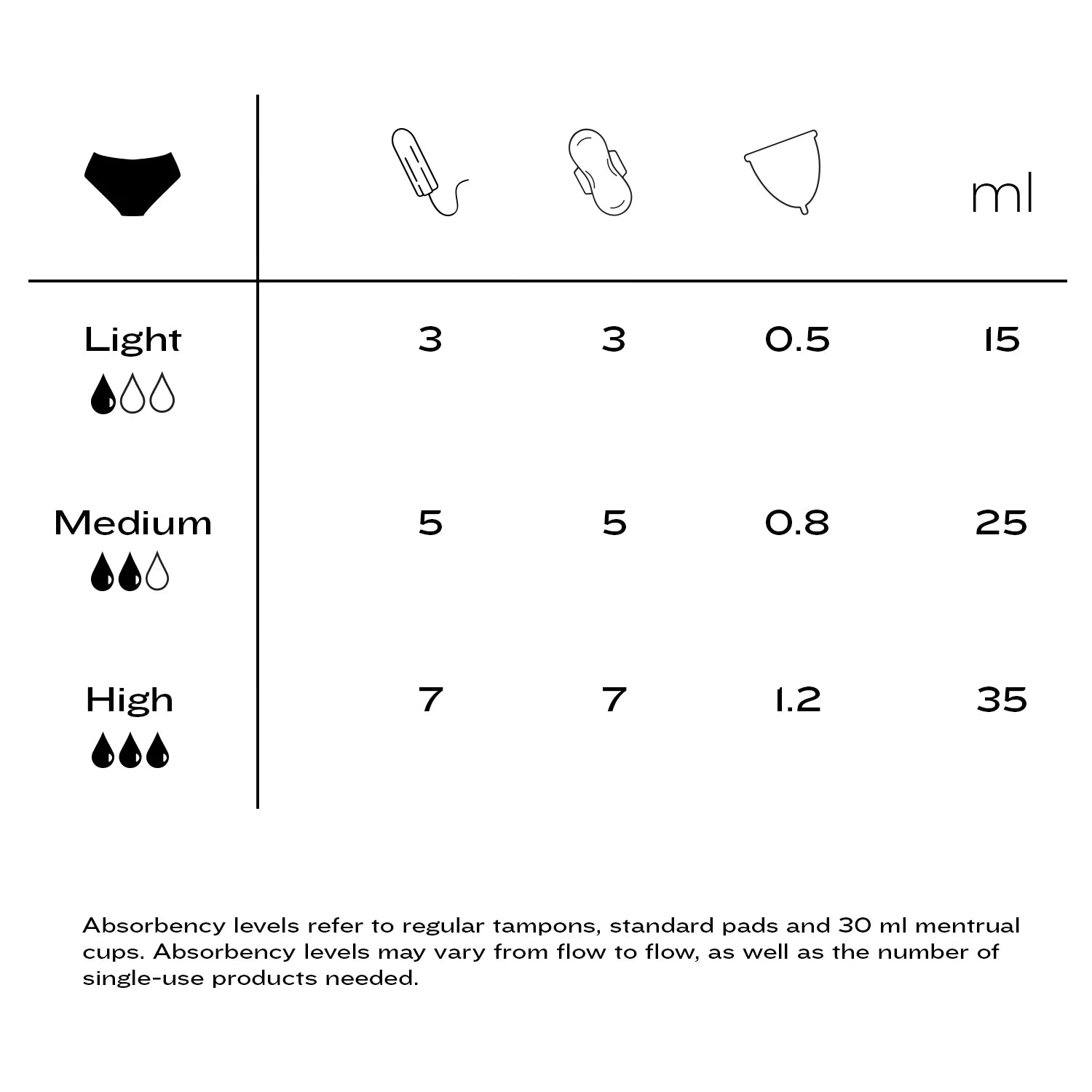 Our Period-Proof Cheeky can hold up to 15ml (≈ 3 tampons), the Lace Highwaist Brief can hold 25ml (≈ 5 tampons) and the Micro Highwaist Briefs can hold 35ml of menstrual liquid (≈7 tampons).
