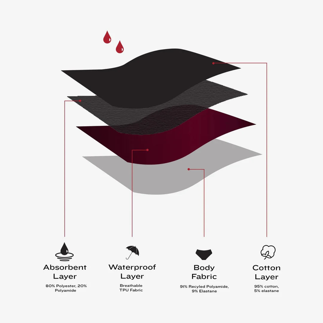 Our period panties is designed to keep you comfy and dry thanks to a period-proof, multi-layer absorption gusset. The size and composition of the absorption gusset vary depending on the absorbency level you choose (a bigger gusset equals higher absorption and protection). Below you can find the detailed composition and number of layers per period panty model. We have designed the fit of each panty to perfectly embrace your curves and provide secured comfort and maximized protection.