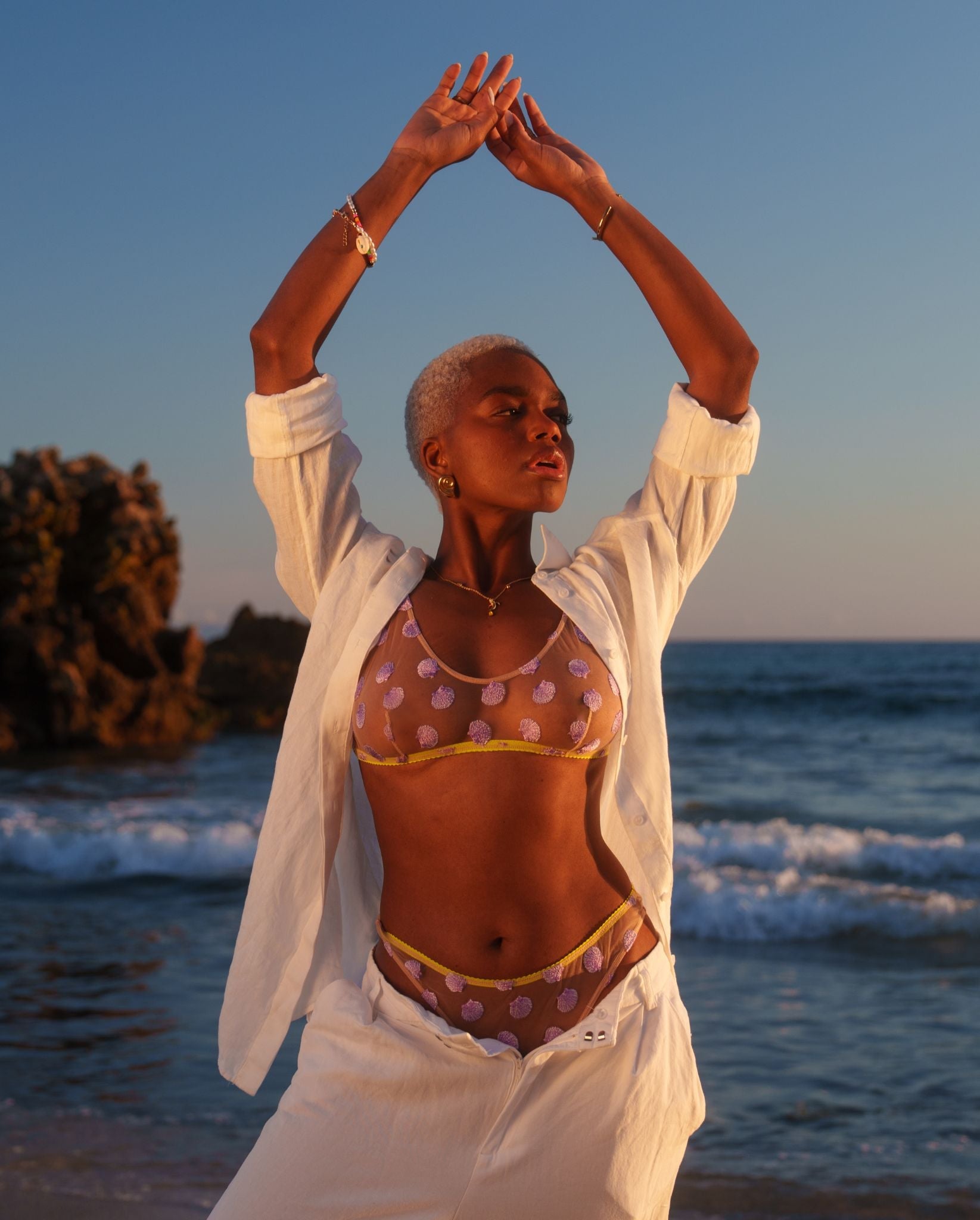 - Crafted from a sheer mesh with all-over embroidered shells