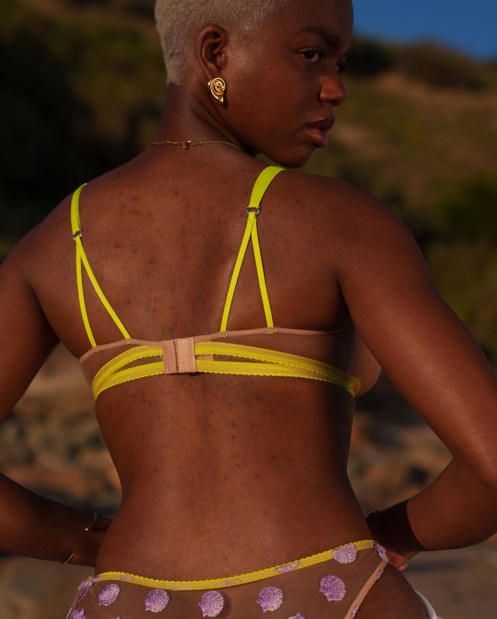 - Crafted from a sheer mesh with shell shaped patches at cups